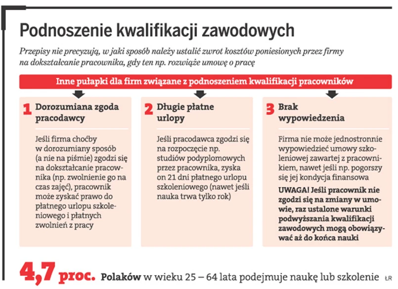 Jeśli zrobią to tuż po tej dacie, mogą być zmuszeni do zwrotu prawie całej pomocy otrzymanej od firmy. Eksperci wskazują, że przepisy o szkoleniach zamiast zachęcać pracodawców do wysyłania pracowników na kursy, a tych do podnoszenia własnych kwalifikacji, mogą przynosić odwrotny skutek.