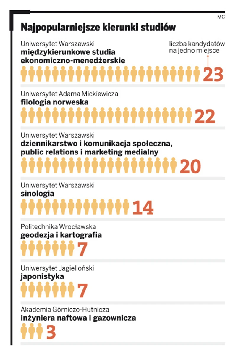 Biorąc pod uwagę stosunek liczby kandydatów do liczby oferowanych na danych kierunkach miejsc, znacznie większą popularnością zaczynają się cieszyć studia egzotyczne (jak choćby japonistyka) oraz techniczne. Na jedno miejsce na geodezji i kartografii na Politechnice Wrocławskiej dostać chce się siedem osób. Tymczasem na prestiżowej Katedrze Prawa na Uniwersytecie Jagiellońskim na jedno miejsca przypada w tym roku jedynie dwóch kandydatów.
