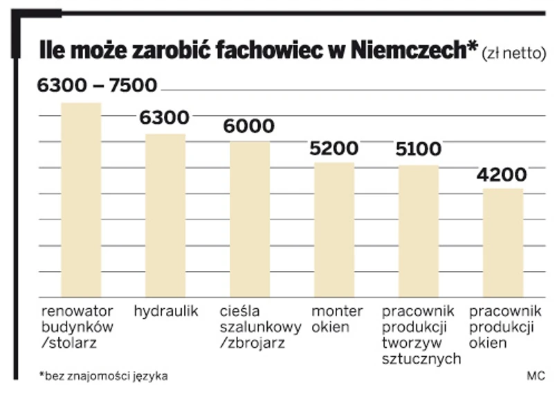 Stawka dla polskiego stolarza pracującego w Niemczech wynosi od 6,3 do 7,5 tys. zł netto, a dla robotnika pracującego przy produkcji tworzyw sztucznych – 5,1 tys. zł netto. Fachowcy znający niemiecki mogą liczyć na znacznie wyższe zarobki – np. zbrojarz z językiem dostaje 8 tys. zł netto, podczas gdy ten mówiący tylko po polsku o 2 tys. złotych mniej.