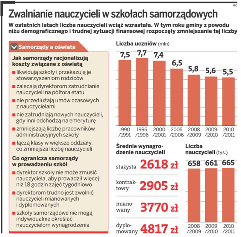 Samorządy tłumaczą to niżem demograficznym (w ciągu 20 lat liczba uczniów zmniejszyła się o 2 mln), niższą subwencją oświatową i obowiązkiem wypłaty (od dwóch lat) specjalnego dodatku uzupełniającego dla pedagogów.