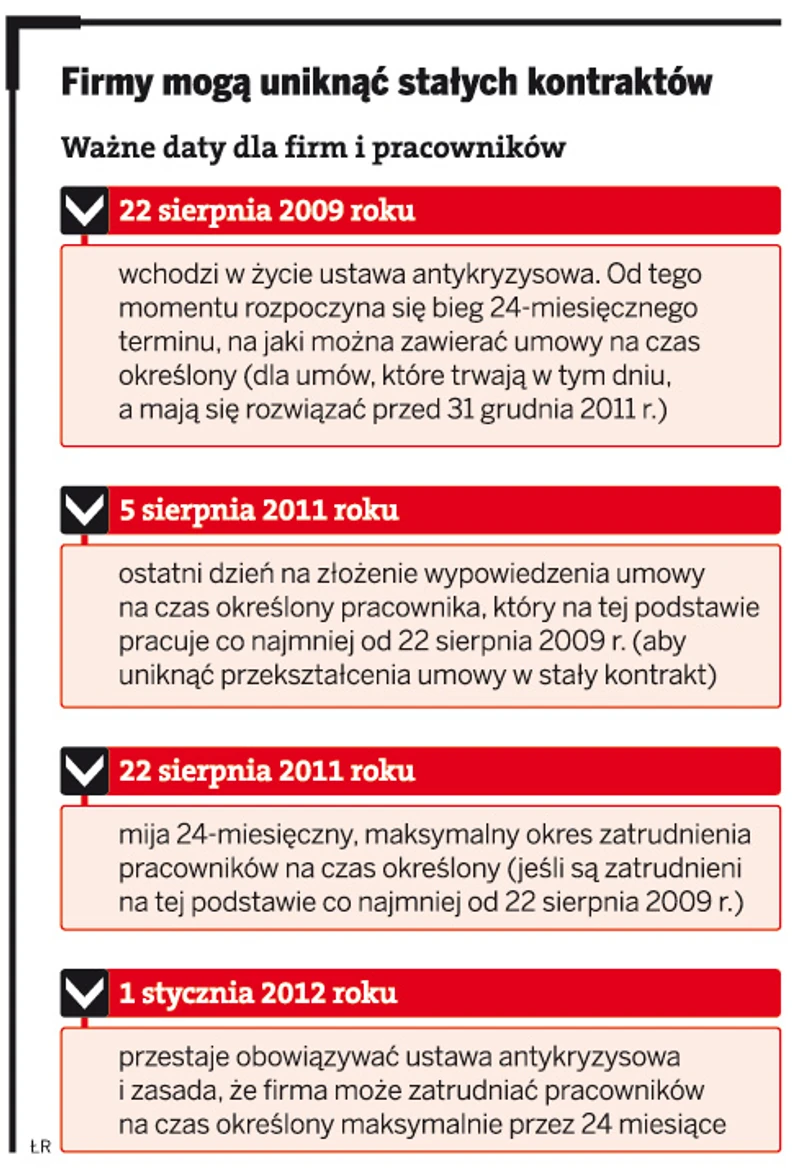 Aby tego uniknąć, firmy mogą wypowiadać pracownikom czasowe umowy o pracę przed końcem 24 miesięcy zatrudnienia. Dla kontraktów, które trwały już lub zostały zawarte 22 sierpnia 2009 r., termin ten upływa 22 sierpnia 2011 r.
