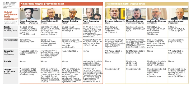Jednak oprócz wojewody śląskiego raczej nie ma w rządowej administracji krezusów. Zupełnie inaczej sytuacja wygląda na stanowiskach prezydentów miast – co najmniej kilku z nich można uznać za milionerów. Prezydent stolicy ma ponad 3 mln zł samych oszczędności i funduszy inwestycyjnych. Do tego 200-metrowy dom i 78-metrowe mieszkanie, wysokiej klasy samochód i żadnych zobowiązań finansowych. Hanna Gronkiewicz-Waltz poza sprawowaniem urzędu prezydenta wykłada na Uniwersytecie Warszawskim. Za rekina inwestycji można z kolei uznać prezydenta Gdańska Pawła Adamowicza, który ma 7 mieszkań, a z samego wynajmu uzyskuje ok. 143 tys. zł. Przy tym ma do spłaty kredyty w wysokości ok. 440 tys. franków. Adamowicz inwestuje też w fundusze i akcje.
