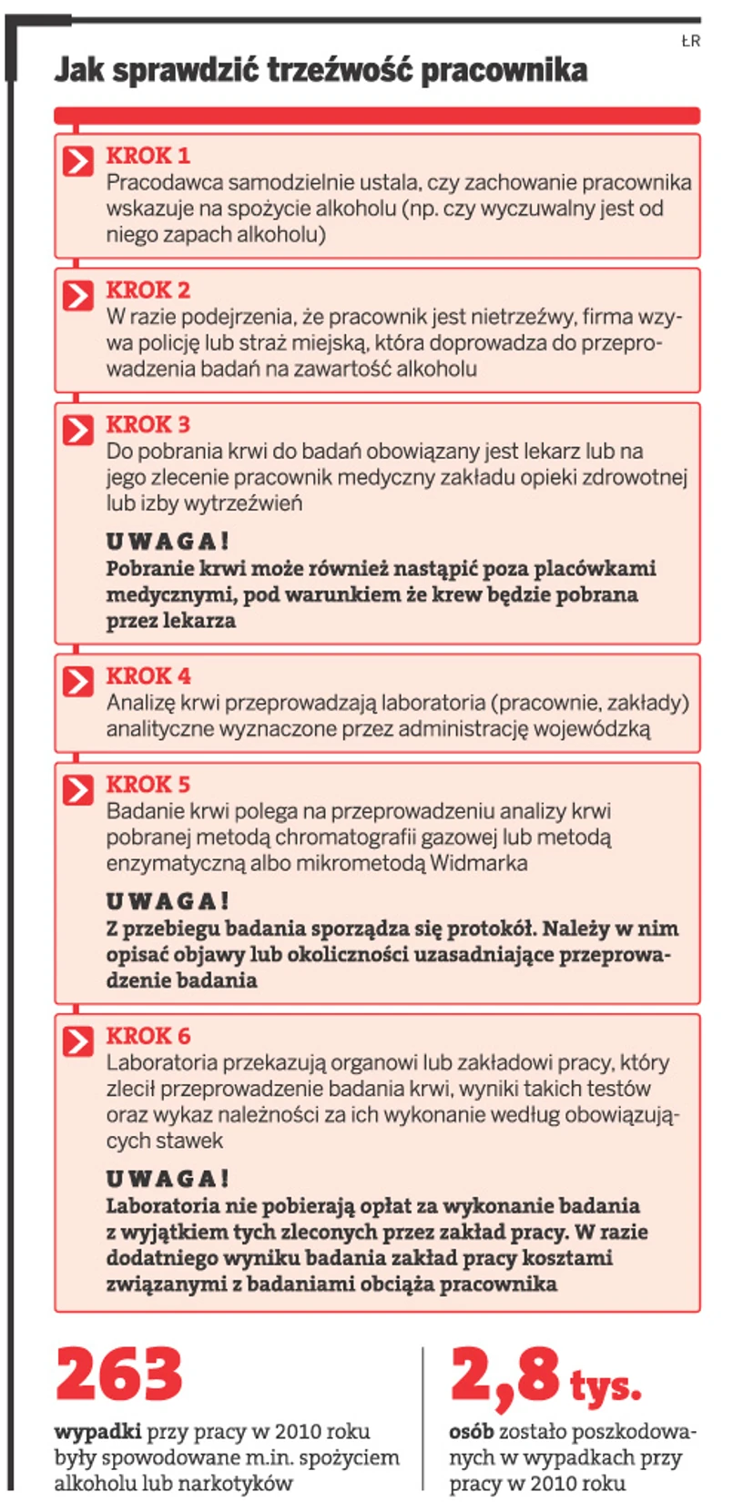 Poddawanie pracowników badaniom na zawartość alkoholu jest możliwe dzięki nowelizacji ustawy z 26 października 1982 r. o wychowaniu w trzeźwości i przeciwdziałaniu alkoholizmowi (t.j. Dz.U. z 2007 r. nr 70, poz. 473 z późn. zm.). Z art. 17 par. 3 tej ustawy wynika, że na żądanie kierownika zakładu pracy, osoby przez niego upoważnionej, a także na żądanie pracownika badanie stanu trzeźwości pracownika przeprowadza uprawniony organ powołany do ochrony porządku publicznego (czyli np. policja). Zabieg pobrania krwi ma wykonywać fachowy pracownik służby zdrowia.