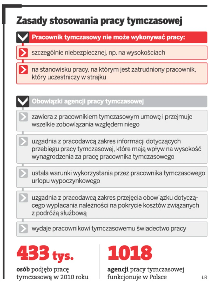 Jego zdaniem jednym ze sposobów na uniknięcie stałego kontraktu jest skorzystanie z usług pracy tymczasowej. Osoby dotychczas zatrudnione w firmach na czas określony mogą być przejmowane przez agencje zatrudnienia, które formalnie staną się ich pracodawcą. Dlatego w najbliższych miesiącach spodziewają się one wzrostu zainteresowania pracą tymczasową.