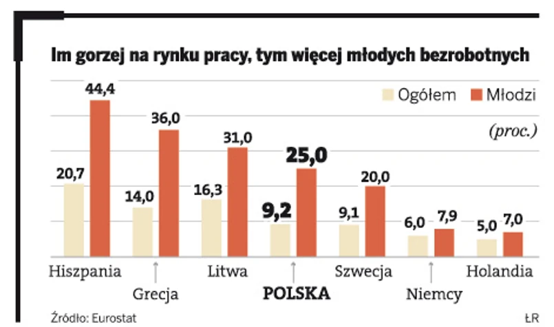 Bez pracy jest aż 25 proc. osób, które nie ukończyły 25. roku życia. Ale rzesza młodych bezrobotnych to nie polski ewenement – tak jest niemal w całej Unii Europejskiej, bo pracodawcy zmuszeni przez kryzys do cięcia kosztów, w pierwszej kolejności zwalniali młodych. Teraz, choć zaczynają przyjmować, to wolą starszych, z doświadczeniem. – Młodzi zawsze pierwsi padają ofiarami spadku koniunktury gospodarczej i niestety jako ostatni doświadczają jej poprawy – podsumowuje Maciej Bukowski z Instytutu Badań Strukturalnych.