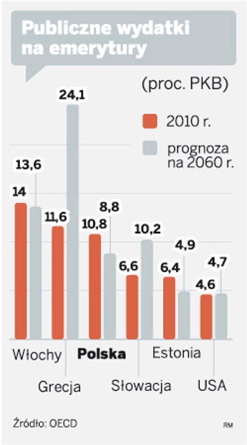 W całkiem innej sytuacji niż Polska są pozostałe kraje OECD. Tam wydatki na emerytury będą rosnąć. W niektórych krajach wręcz eksplodują. Tak na przykład stanie się w Grecji, gdzie na te świadczenia państwo ma wydawać 24,1 proc. PKB. Obecnie przeznacza na ten cel 11,6 proc. Podobnie będzie w Hiszpanii, gdzie wydatki mają wzrosnąć z 8,9 proc. PKB do 15,1 proc.