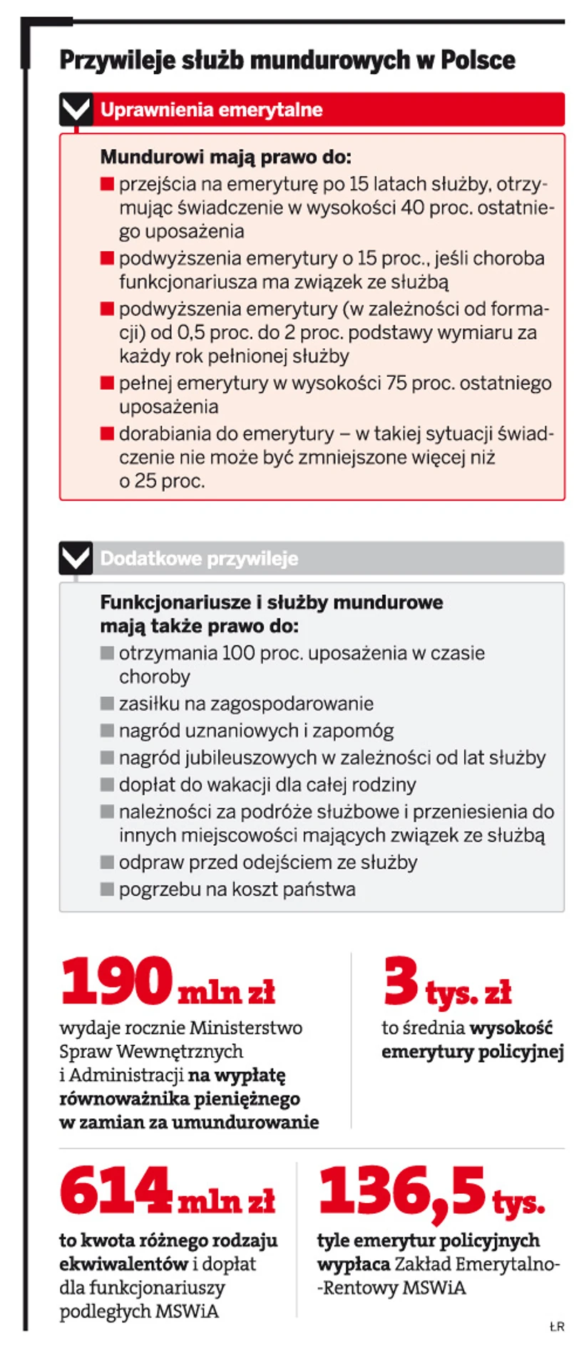 Funkcjonariusze oraz żołnierze zawodowi, obok górników i sędziów, to ostatnie grupy zawodowe korzystające ze specjalnych przywilejów emerytalnych oraz socjalnych. Rodziny mundurowych mają prawo m.in. do dopłat do wakacji, a także do otrzymania specjalnego dodatku, jeżeli nie posiadają własnego mieszkania. Rząd od dawna zapowiadał ograniczenie przywilejów, ale dopiero przed wyborami faktycznie zajął się przygotowaniem rozwiązań mogących przynieść oszczędności.