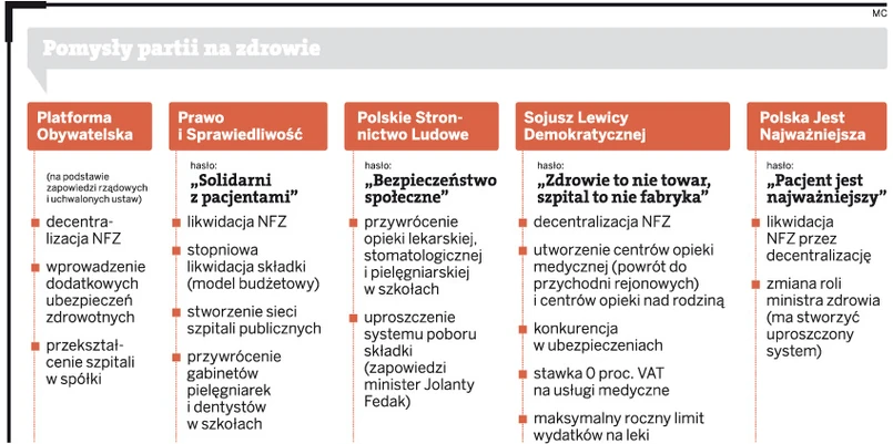 W służbie zdrowia najmniej rynkowe rozwiązania proponuje PiS – zdecydowane „nie” dla prywatyzacji szpitali. Najbardziej liberalne są PO i PJN. W jednym wszystkie partie się zgadzają: system działa źle i wymaga naprawy.