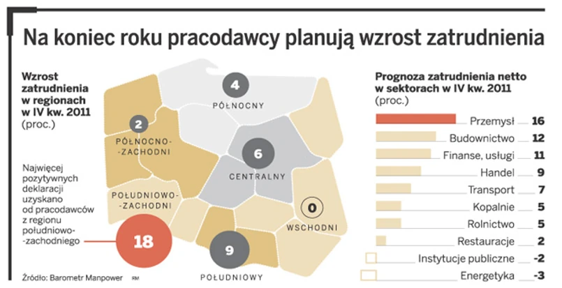 Najbardziej korzystny dla poszukujących pracy będzie południowo-zachodni region Polski. Tam aż 18 proc. więcej pracodawców będzie chciało zatrudniać w porównaniu z tymi, którzy będą redukować zatrudnienie. Pozytywne tendencje odnotują też region południowy i centralny. Na drugim biegunie są regiony: północny, północno-zachodni oraz wschodni. Tam nie będzie poważniejszych zmian, jeżeli chodzi o zmianę liczby miejsc pracy.
