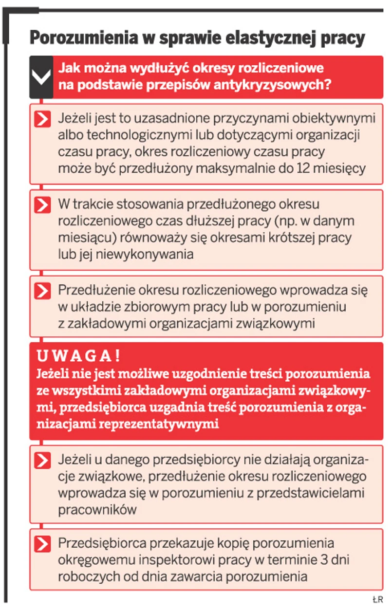 Jego zdaniem potwierdzają to dane dotyczące zawartych porozumień. Aż w 707 przypadkach przedłużenie okresu rozliczeniowego nastąpiło na podstawie porozumienia z przedstawicielami pracowników, a tylko w 333 – na mocy porozumienia ze związkami zawodowymi. Wprowadzenie dłuższych okresów rozliczeniowych za zgodą przedstawicieli zatrudnionych jest jednak możliwe tylko wtedy, gdy u danego przedsiębiorcy nie działają zakładowe organizacje związkowe. Z kolei w 20 firmach okres rozliczeniowy został przedłużony w układzie zbiorowym pracy (czyli także za zgodą związków zawodowych).