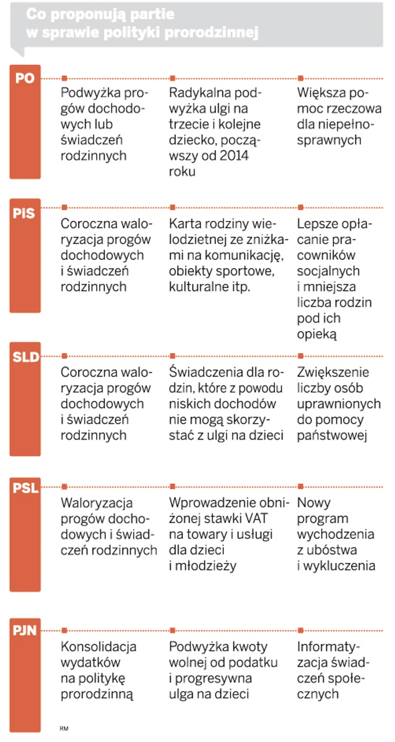 Ponadto wszystkie ugrupowania poruszają kwestię zwiększenia dzietności i wsparcia rodzin, zwłaszcza tych najbiedniejszych. Na pewno na celowniku znajdzie się system podatkowy – PJN proponuje podniesienie kwoty wolnej i uzależnienie jej od liczby osób w rodzinie. PO z kolei rekomenduje radykalne zwiększenie ulgi na trzecie i czwarte dziecko, choć dopiero od 2014 roku, gdy przestanie nas obowiązywać procedura nadmiernego deficytu.