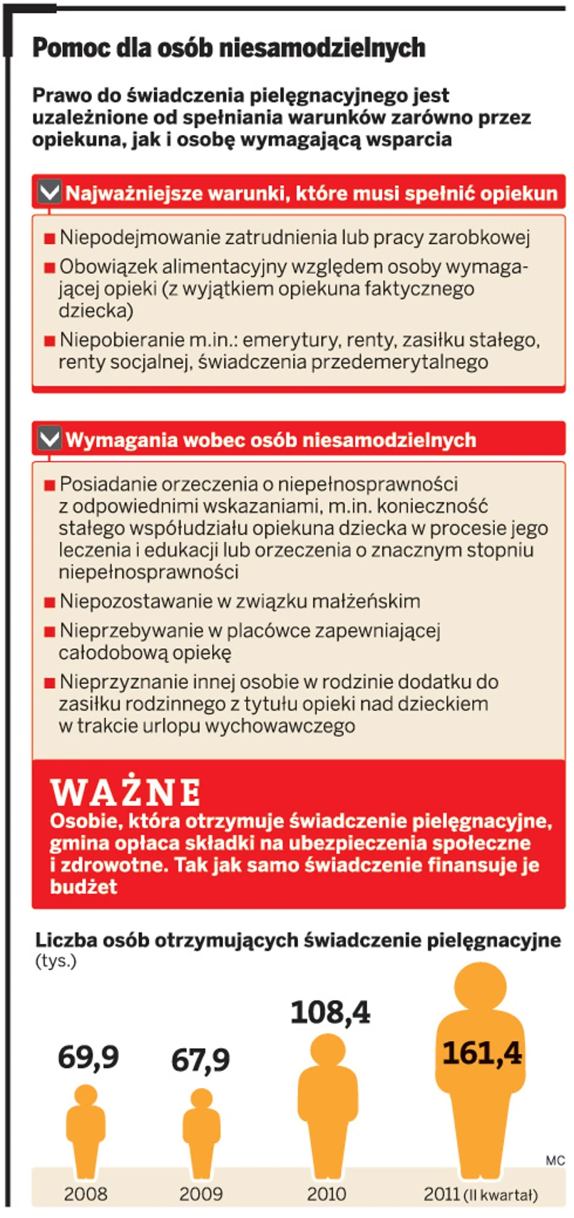 W ciągu półtora roku o 93 tys. zwiększyła się liczba osób, które mają przyznane świadczenie pielęgnacyjne. To oznacza, że pobiera je już 161,4 tys. opiekunów. Gminy przyznają, że mają problem z weryfikacją tego, komu pomoc jest przyznawana. Nawet drobiazgowa ocena sytuacji ubiegającego się o nią nie daje bowiem pewności, czy nie dochodzi do próby wyłudzenia świadczenia.