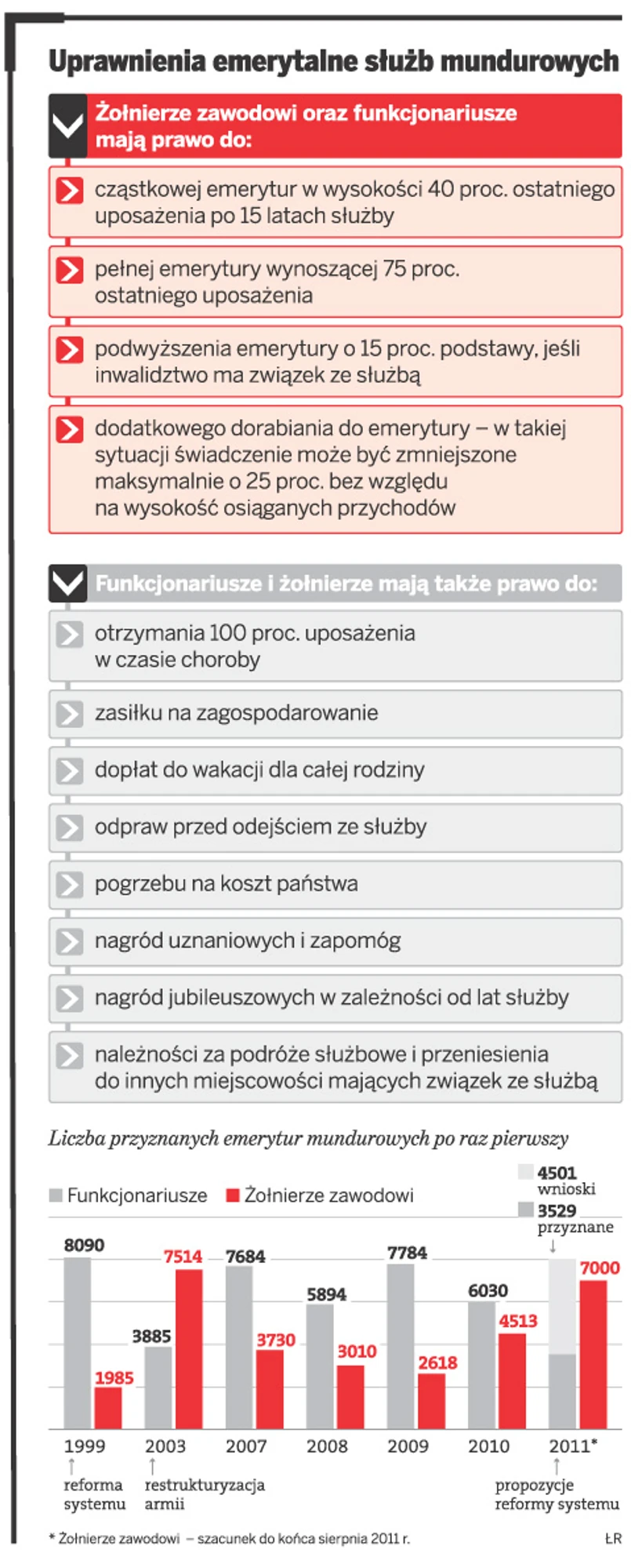 W 2010 roku na emeryturę przeszło 6 tys. funkcjonariuszy, w tym 1,6 tys. osób mających co najmniej 30-letni okres wysługi emerytalnej. Podobnie jest w MON, gdzie w ubiegłym roku prawie połowa osób, które zdecydowały się na przejście na emeryturę, miała ponad 26 lat służby.