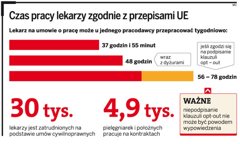 Dzięki stosowaniu umów cywilnoprawnych placówki medyczne mogły rozwiązać problem zaostrzonych norm czasu pracy. Zgodnie z prawem unijnym od 2008 roku lekarze etatowi nie mogą pracować dłużej niż 48 godzin tygodniowo (włącznie z dyżurami). Ten czas może być wydłużony, pod warunkiem, że medyk wyrazi na to zgodę i podpisze tzw. klauzulę opt-out.