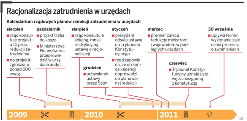 W ministerstwach polecenie premiera wdrożyło tylko kilka z nich. Jednym z pierwszych był resort spraw wewnętrznych i administracji, który dokonał cięć na podstawie ustawy o zwolnieniach grupowych. Obecnie zatrudnionych jest tam 1098 pracowników. To tylko o pięciu pracowników więcej niż według stanu z 2009 roku. Za racjonalizowanie zatrudnienia wziął się też resort obrony narodowej, ale to na razie plany. Chce dopiero zlikwidować 42 stanowiska. Obecnie wciąż pracuje tam 847 pracowników. To o 107 pracowników więcej niż 2009 roku. Ponadto dodatkowo poszukuje kolejnych na 7 stanowisk.
