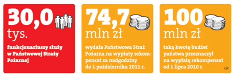 Związkowcy z NSZZ „Solidarność” przygotowali wniosek do Trybunału Konstytucyjnego (TK) o stwierdzenie niezgodności z ustawą zasadniczą art. 97c ust. 1 ustawy z 24 sierpnia 1991 r. o Państwowej Straży Pożarnej (tj. Dz.U. z 2009 r. nr 12, poz. 68 z późn. zm.). Ma on trafić do TK jeszcze w tym miesiącu. Zaskarżony przepis obowiązuje od stycznia 2011 r. Zgodnie z nim strażak za godzinę dodatkowej służby powyżej 40 godzin tygodniowo otrzymuje 60 proc. z 1/172 przeciętnego uposażenia (3945,31 zł). To oznacza 13,70 zł za jedną nadgodzinę.