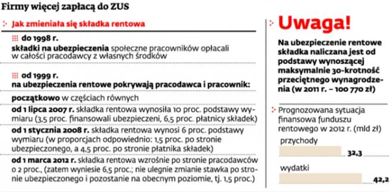 Gdyby tak się stało w ich kieszeniach zostałoby 8,5 mln zł miesięcznie (przyjmując, że każdy maiłby płacę minimalną, czyli 1500 zł w 2012 r.). Natomiast jeśli także pracodawcy zwolnieni byliby z płacenia części składki rentowej, zaoszczędziliby 36,8 mln zł. Łącznie zatem wpływy do funduszu rentowego byłyby mniejsze tylko o 45,3 mln zł. Nie jest to znaczący uszczerbek, biorąc pod uwagę, że przychody funduszu w przyszłym roku wyniosą 32,3 mld zł. Korzyści mogą być za to dużo wyższe. Wzrosłyby wpływy z podatków i innych składek niż rentowa, bo zwolnienie z jej opłacenia zachęciłoby starsze osoby do częstszego podejmowania zatrudnienia. Wyższy wskaźnik pracujących można osiągnąć też, jeśli przynajmniej część składki rentowej zaliczana byłaby na poczet emerytury i wpływała na podwyższenie wysokości tego