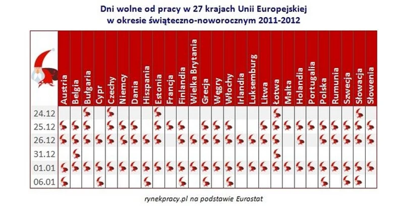 Podobne różnice dotyczą także samych świątecznych dni. Wydawałoby się, że wolne od pracy w dzień Bożego Narodzenia to oczywistość. W Polsce owszem, ale w pozostałych krajach unijnych bywa różnie. 25 grudnia na labę mogą sobie pozwolić wszyscy poza Cypryjczykami, Hiszpanami, Irlandczykami, Brytyjczykami oraz mieszkańcami Luksemburga. Z kolei 26 grudnia w firmie muszą stawić się Francuzi, Maltańczycy oraz Portugalczycy.