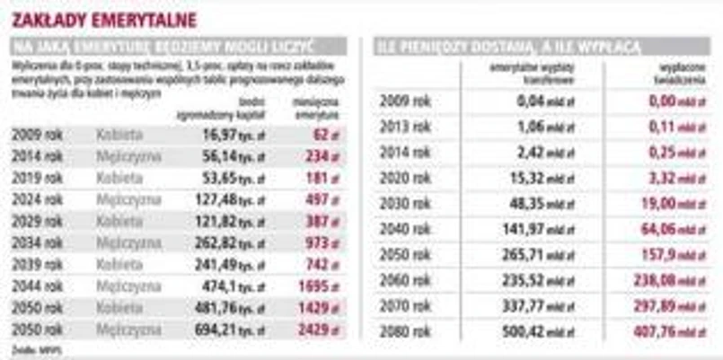 Zadbał też o kobiety, proponując sposób wyliczania emerytury oparty na wspólnych dla obu płci tabelach prognozowanego dalszego trwania życia. Gdyby nie to, rozpiętości w świadczeniach dla kobiet i mężczyzn byłyby dużo większe niż to wynika z obecnych symulacji Ministerstwa Pracy i Polityki Społecznej. Z tych szacunków wynika, że w momencie przechodzenia na emeryturę osób z rocznika 1959 - w 2019 roku dla kobiet i 2024 roku dla mężczyzn - kobiety będą mogły liczyć przeciętnie na 181 zł dodatkowej emerytury, a mężczyźni na 497 zł. To efekt m.in. dłuższego o pięć lat okresu aktywności zawodowej w przypadku mężczyzn (plus element przerw w pracy na wychowanie dziecka i przeciętnie niższe zarobki). W rezultacie przeciętnie kobieta urodzona w 1959 roku zgromadzi w OFE nieco ponad 53 tys. zł, a mężczyzna 127 tys. zł. Przypomnijmy, że, jak już informowała GP, kobietom, które zaczną kończyć aktywność zawodową od 2009 roku emerytury będą wypłacały OFE.