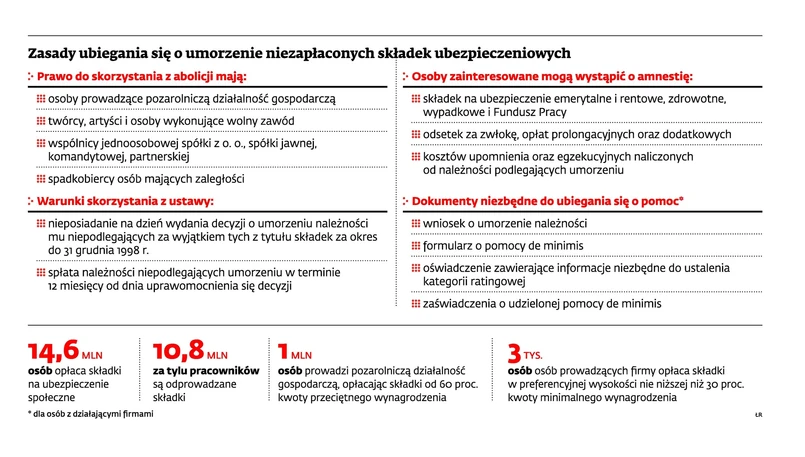 A wątpliwości w sprawie abolicji jest dużo. Urzędnicy kwestionują wyjaśnienia polskiej strony, że ustawa wprowadzająca amnestię będzie mieć wpływ na rozwój regionalny. Chcą się dowiedzieć, w jaki sposób do tego dojdzie. UOKIK musi także ustalić, dlaczego w ustawie znalazły się dwa różne terminy złożenia wniosku o umorzenie. Pierwszy umożliwia składanie takich dokumentów w ciągu 24 miesięcy od dnia wejścia w życie ustawy. Drugi termin (12-miesięczny) liczony jest od daty uprawomocnienia się decyzji ZUS o podleganiu obowiązkowym ubezpieczeniom. Polski rząd ma więc wyjaśnić, do kiedy faktycznie przedsiębiorcy będą mogli składać wnioski.