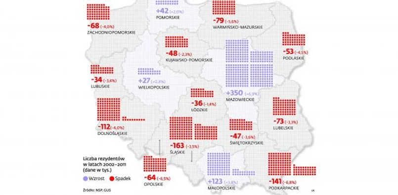 W latach 2002–2011 liczba rezydentów w dwunastu polskich województwach zmniejszyła się aż o 918 tys. osób – wynika z danych GUS ze spisów powszechnych. W tym samym czasie mieszkańców przybyło tylko w czterech województwach: mazowieckim (+ 350 tys.), małopolskim (+ 123 tys.), pomorskim (+ 42 tys.) oraz wielkopolskim (+ 27 tys.). Zatem łącznie regiony te zyskały w ciągu dziewięciu lat 542 tys. rezydentów.