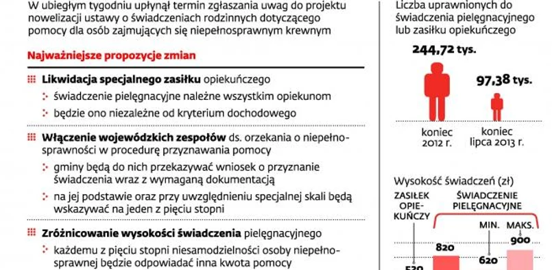 przepisów otrzymywało łącznie 97 389 tys. opiekunów. Z tego 92 183 tys. decyzji gmin dotyczyło przyznania świadczenia pielęgnacyjnego, a tylko 5206 specjalnego zasiłku opiekuńczego. To oznacza, że 147 334 tys. osób zostało od lipca pozbawionych wsparcia związanego z zajmowaniem się niepełnosprawnym krewnym.