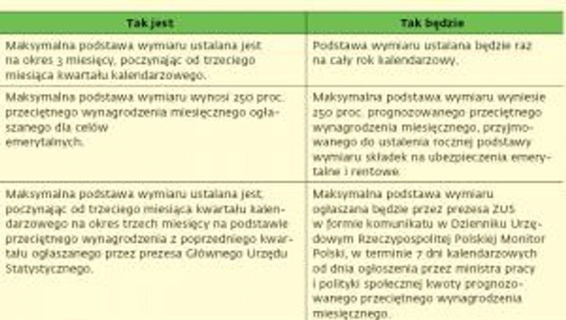 Po pierwsze, maksymalna podstawa wymiaru składek na to ubezpieczenie będzie w istocie ustalana na cały rok kalendarzowy, a nie jak dotychczas na okres 3 miesięcy. Po drugie, kwotę maksymalnej podstawy składek na dobrowolne ubezpieczenie chorobowe będzie stanowiła kwota 250 proc. prognozowanego przeciętnego wynagrodzenia miesięcznego przyjmowanego do ustalenia rocznej podstawy wymiaru składek na ubezpieczenia emerytalne i rentowe, a nie jak to miało miejsce dotychczas kwota 250 proc. przeciętnego wynagrodzenia miesięcznego z poprzedniego kwartału, ogłaszanego dla celów emerytalnych.