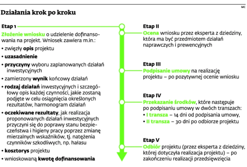 Także w projektach inwestycyjnych są działania, na które można otrzymać dofinansowanie. Są to zakup i instalacja, np.: osłon do niebezpiecznych stref maszyn i urządzeń, zakup środków ochrony indywidualnej (wyłącznie dla przedsiębiorstw zatrudniających do 49 pracowników, pod warunkiem przedstawienia i pozytywnej oceny dokumentacji potwierdzającej prawidłowe przeprowadzenie oceny ryzyka zawodowego oraz dokonanie na jej podstawie właściwego doboru środków ochrony indywidualnej).