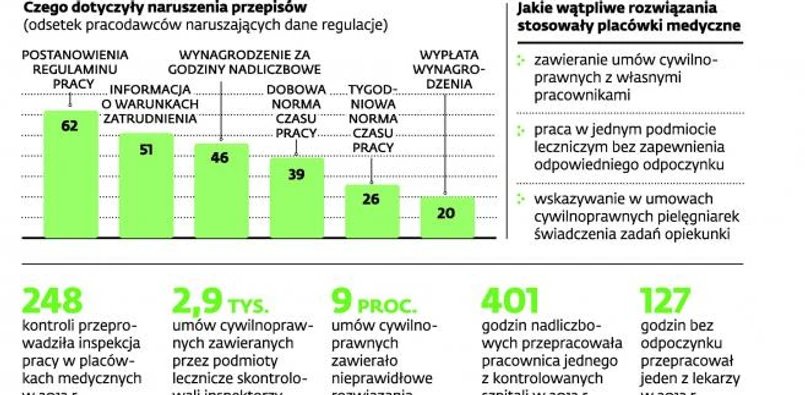 Placówki medyczne muszą stosować się do unijnych norm czasu pracy lekarzy i pielęgniarek. To powoduje kłopoty z zapewnieniem całodobowej opieki wszystkim pacjentom. Dlatego po wypracowaniu limitu zatrudnienia na etacie pracownicy wykonują swoje obowiązki na umowach cywilnoprawnych jako osoby fizyczne albo przedsiębiorcy. W ten sposób omijają przepisy o czasie pracy, co przynosi niemałe oszczędności, także w zakresie składek na ubezpieczenia społeczne.