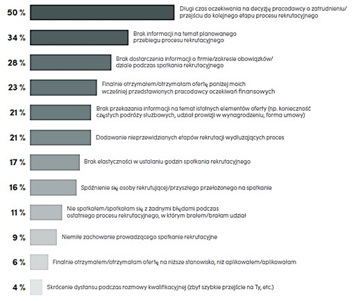 Z tym problemem spotkała się połowa badanych w raporcie Antal. Dla kandydata, który jest zaangażowany w proces rekrutacji, niezwykle ważne jest, by być w stałym kontakcie z działem HR. Komunikacja z kandydatem powinna przebiegać sprawnie i zrozumiale, tak, by nie generować na każdym etapie pytań czy zbędnie przedłużać procesu decyzji. To przekłada się na korzystny wizerunek organizacji i najbardziej efektywny sposób budowania marki pracodawcy. Z kolei niedotrzymanie terminu, nieprzekazanie informacji zwrotnej lub jej brak, spowodują, że kandydat podejmuje współpracę z innym pracodawcą, a sam proces oceni negatywnie.