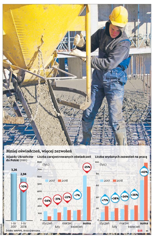 To, że spada liczba oświadczeń na pracę dla Ukraińców, na pozór jest złą informacją. Po pierwszych czterech miesiącach tego roku ten rodzaj zatrudnienia dotyczył 464 tys. osób, rok wcześniej 615 tys. Spadek jest więc duży, wyniósł aż jedną czwartą. Powód jednak jest w dużym stopniu czysto statystyczny: zmieniły się zasady rejestracji pracy na oświadczenia. Od stycznia tego roku trzeba za nie zapłacić 30 zł (za każde), a dodatkowo pracodawca powinien realnie imigranta zatrudnić. Te zmiany prowadzą do tego, że mniej jest „pustych” oświadczeń, bowiem w poprzednich latach, jak szacował resort rodziny i pracy oraz demografowie, zarejestrowane oświadczenia były wykorzystywane w 60 proc.