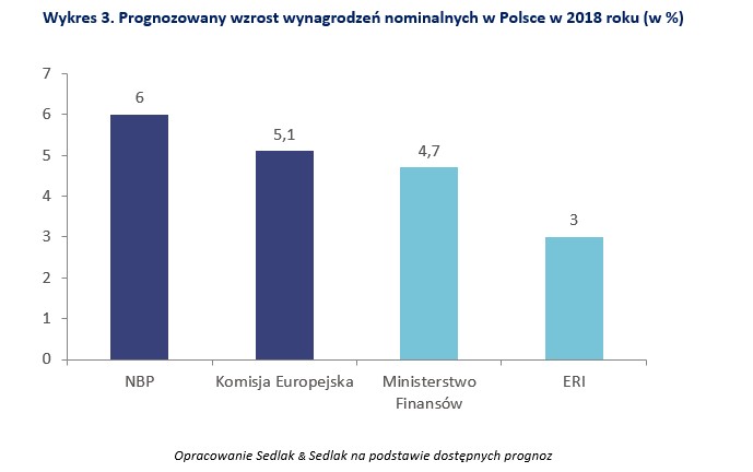 Najbardziej optymistyczny scenariusz na 2018 rok założył NBP. Według szacunków tej instytucji zawartych w „Raporcie o inflacji”, wzrost wynagrodzeń w 2018 roku wyniesie 6%, a w 2019 roku 6,2%. Odpowiednio inflacja w tych latach wyniesie 2% i 2,5%.