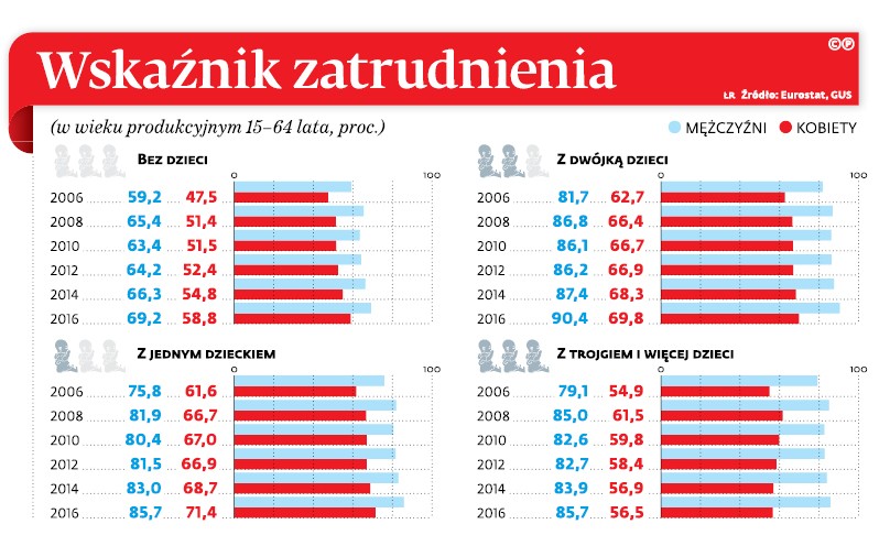 Prof. Irena Kotowska zwraca uwagę na interesującą korelację wieku kobiet, pracy i posiadania dziecka. – Generalnie zależność jest taka, że ojcowie mają większe wskaźniki zatrudnienia od mężczyzn, którzy nie mają dzieci. W przypadku kobiet zazwyczaj jest tak, że wychowywanie dziecka ogranicza wskaźniki zatrudnienia – mówi prof. Kotowska. Z jej badań wynika, że kobiety do 44. roku życia z dzieckiem pracują rzadziej niż te bez potomstwa. Dane Eurostatu pokazują, że w grupie kobiet między 20. a 49. rokiem życia z dziećmi poniżej 6 lat pracuje 69,1 proc. Już z dzieckiem powyżej 12. roku życia wskaźnik ten „skacze” do ponad 80 proc. I nie ma różnicy, czy jest to dwoje, czy jedno dziecko. Dla porównania w tej grupie wiekowej bez dziecka wskaźnik pracujących w grupie 20–49 lat wynosi 78,8 proc. Ale niezależnie od wieku (dziecka czy matki) polskie matki pracują częściej niż w innych krajach UE.