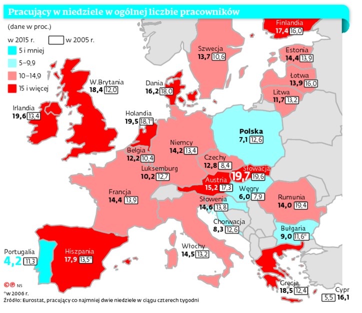 Mocno wyróżniamy się pod tym względem na tle krajów Unii Europejskiej. Mniejszy odsetek pracujących w niedzielę jest tylko na Węgrzech (6,4 proc.) oraz w Portugalii (4,2 proc.). A największy na Słowacji, w Irlandii, Holandii, Grecji, Wielkiej Brytanii, Hiszpanii i Finlandii, gdzie wynosi 17,4–19,7 proc. Przy tym średnia dla Wspólnoty jest ponad dwa razy wyższa niż u nas. – To dlatego, że w krajach zamożniejszych udział usług w PKB jest większy niż w Polsce – uważa dr Jakub Borowski, główny ekonomista Credit Agricole. Wobec tego pracuje w nich więcej osób, także w niedzielę. – Ponadto duża część państw Unii Europejskiej to kraje turystyczne – dodaje dr Borowski. Musi więc przybywać pracowników, którzy obsługują rosnącą liczbę zwiedzających w każdym dniu tygodnia.