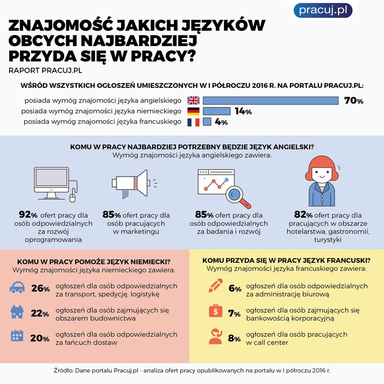 Jak wynika z analizy Pracuj.pl w I półroczu 2016 roku 70% ofert pracy publikowanych na portalu zawierała wymóg znajomości języka angielskiego. Z danych wynika również, że znajomość języka angielskiego jest coraz bardziej potrzeba na rynku pracy. W I półroczu 2015 roku 47% ogłoszeń zawierało wymóg znajomości języka angielskiego, w ciągu roku nastąpiła więc zmiana o 23 p.p.