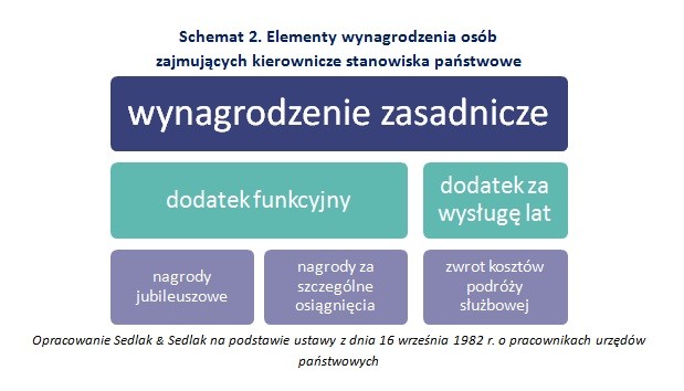 Wartość wynagrodzeń osób na kierowniczych stanowiskach państwowych oblicza się mnożnikowo, na podstawie kwoty bazowej. Przypomnijmy, że wynosi ona tyle samo od 2008 roku – 1766,46 PLN (1). Szczegółowo rozpisane stanowiska mogą Państwo znaleźć w źródle (5), natomiast w artykule skupimy się na wybranych pozycjach. Wynagrodzenie osób wyszczególnionych Rozporządzeniu Prezydenta Rzeczypospolitej Polskiej z dnia 25 stycznia 2002 r. w sprawie szczegółowych zasad wynagradzania osób zajmujących kierownicze stanowiska państwowe, składa się z kilku pozycji. Zostały one w większości przedstawione na schemacie 2.