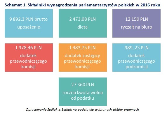 Zacząć należy od kwoty bazowej, która stanowić będzie podstawę do obliczania wynagrodzeń wszystkich omawianych tu stanowisk. Kwota bazowa ustalana jest w ustawie budżetowej rok do roku i obecnie wynosi ona 1 766,46 PLN (1). Pozostaje ona niezmieniona od 2008 roku. Wynagrodzenie posłów i senatorów składa się z kilku elementów. Pierwszym elementem ich zarobków jest wynagrodzenie podstawowe, które równa się sumie wynagrodzenia podstawowego i dodatku funkcyjnego podsekretarza stanu i wynosi 9 892,3 PLN brutto (2). Do tego dochodzi dieta poselska, którą można wykorzystać na koszty związane z wykonywaniem zawodu, wynosząca 25% wynagrodzenia, tj. 2 473,08 PLN. Dietę otrzymują tylko parlamentarzyści zawodowi, to znaczy tacy, którzy nie wykonują aktualnie innych czynności zawodowych. Posłowie mogą zrezygnować z diety na rzecz umowy o pracę, bądź prowadzenia działalności gospodarczej. Parlamentarzyści otrzymują również 12 150 PLN miesięcznie na prowadzenie biura poselskiego. Każdy z nich musi prowadzić przynajmniej jedno biuro. Może być ich więcej, jednak dofinansowanie nie jest zależne od ilości filii biura.