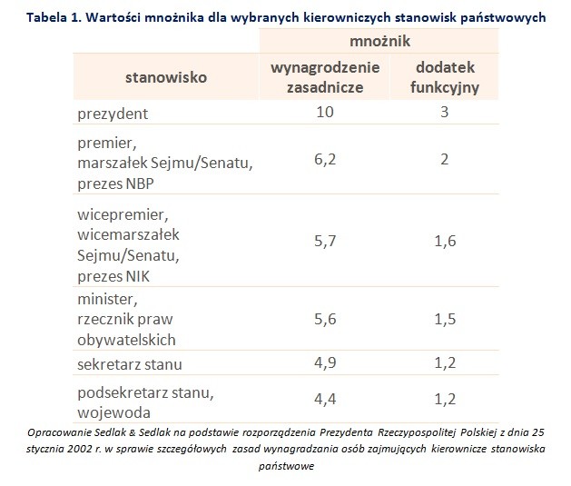 Wynagrodzenie zasadnicze i dodatek funkcyjny oblicza się poprzez pomnożenie kwoty bazowej (1 766,46 PLN) przez mnożnik. Wartości mnożnika dla części stanowisk zostały podane w tabeli 1.