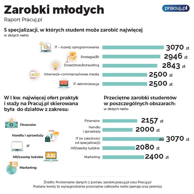 Studenci kierunków związanych z finansami także nie powinni mieć problemu ze znalezieniem ofert praktyk i staży; w I kwartale przyszłych finansistów pracodawcy poszukiwali najczęściej publikując aż 675 ogłoszeń skierowanych do nich, co stanowiło wzrost o 15% w stosunku do I kw. 2015 r. Szczególnie dobrze wynagradzani są pracownicy w obszarze doradztwo/konsulting – studenci mogą w tym obszarze zarobić przeciętnie 2843 zł netto. Dobre informacje płyną także z danych Pracuj.pl dla studentów marzących o karierze w obszarze strategia/business intelligence, również bardzo dobrze opłacany obszar, w którym mediana zarobków wśród studentów sięga 2946 zł netto.