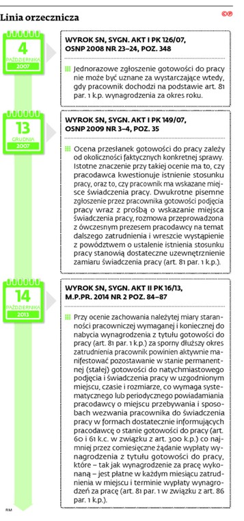 TEZA: Uzewnętrznienie przez pracownika gotowości do pracy może nastąpić przez różne, znane pracodawcy, zachowania pracownika, z których dostatecznie jasno wynika jego wola niezwłocznego podjęcia pracy w danym okresie, gdy zostanie do niej dopuszczony. Zależnie od okoliczności, różna może być też częstotliwość potwierdzania gotowości. Nie można zatem ogólnie i a priori wskazać, w jaki sposób i jak często pracownik powinien uzewnętrzniać (demonstrować) gotowość do pracy. Oceny spełnienia tej przesłanki dokonuje sąd, biorąc pod uwagę całokształt okoliczności faktycznych konkretnej sprawy (art. 81 par. 1 kodeksu pracy).