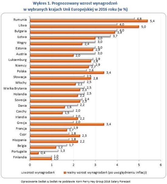 Po uwzględnieniu inflacji, wynagrodzenia w 2016 roku wzrosną w 21 z 28 krajów Unii Europejskiej. Dla porównania, na koniec 2015 roku płace powinny wzrosnąć w 26 z 28 państw członkowskich. Najwyższe zmiany realnych wynagrodzeń prognozowane są na 2016 rok na Litwie, w Estonii i na Łotwie. Wśród krajów o największym prognozowanym wzroście płac realnych znalazła się również Polska, gdzie zarobki wzrosną o 2,5%. Jak wynika z analizowanych prognoz, w największym stopniu wynagrodzenia realne spadną w Belgii, we Włoszech i we Francji. Płace realne zmaleją także w Portugalii, Hiszpanii i we Francji.