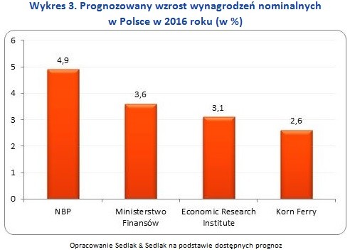 Prognozy wynagrodzeń dla Polski prezentowane przez poszczególne instytucje różnią się między sobą. Na najwyższe podwyżki płac wskazuje Narodowy Bank Polski. Według szacunków zaprezentowanych w listopadowym raporcie o inflacji, zarobki Polaków w 2016 roku wzrosną o 4,9%. Nieco niższy wzrost przewiduje Ministerstwo Finansów. Zdaniem specjalistów z tej instytucji, Polacy mogą oczekiwać podwyżek na poziomie 3,6%. Większymi sceptykami są w tym względzie międzynarodowe firmy zajmujące się analizą wynagrodzeń. I tak firma ERI Economic Research Institute szacuje, że dynamika wzrostu nominalnych wynagrodzeń w naszym kraju wyniesie 3,1%. Z kolei zdaniem ekspertów z Korn Ferry pensje w Polsce wzrosną zaledwie o 2,6%.