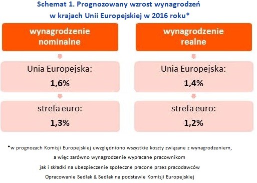 Z kolei z prognoz opracowanych przez Komisję Europejską wynika, że wynagrodzenia nominalne w krajach Unii Europejskiej w 2016 roku wzrosną o 1,6%. Po uwzględnieniu wskaźnika inflacji dynamika wynagrodzeń wyniesie 1,4%. Szacunki dla krajów należących do strefy euro są nieco mniej optymistyczne. Według Komisji Europejskiej płace nominalne w tych państwach wzrosną w 2015 roku o 1,3%. Siła nabywcza wynagrodzeń zwiększy się natomiast o 1,2%.