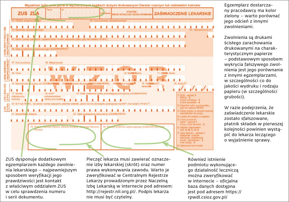 Pierwszą czynnością po dostarczeniu przez pracownika zwolnienia powinno być więc porównanie go z oficjalnym wzorem, który jest dostępny m.in. na stronie ZUS. [ramka]