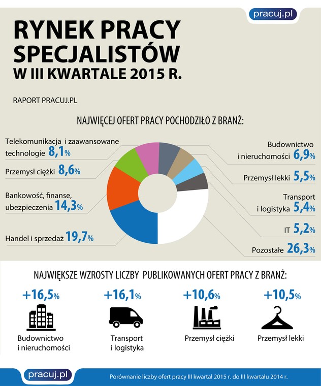 Jak wynika z danych Pracuj.pl, pracodawcy z branży handel i sprzedaż opublikowali w III kwartale 2015 r. 21 971 ogłoszeń o pracę, co oznacza wzrost o 4 proc. rok do roku. Drugą pod względem liczby opublikowanych ofert była w III kwartale branża bankowość, finanse, ubezpieczenia z liczbą 15 906 ogłoszeń o pracę (3,2 proc. wzrostu rok do roku). Na trzecim miejscu uplasowała się branża przemysł ciężki, z której pochodziło 8,6 proc. opublikowanych w III kwartale ofert (10,6 proc. wzrostu rok do roku).