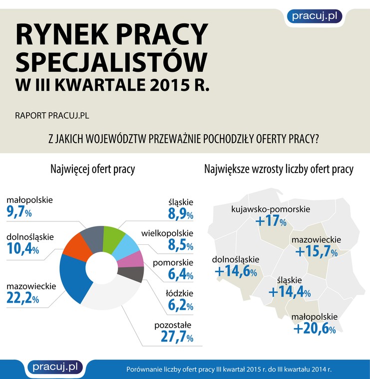 Najwięcej ofert pracy pochodziło z województwa mazowieckiego – nieco ponad jedna piąta wszystkich ogłoszeń z III kwartału 2015r.; kolejne pod względem liczby opublikowanych ofert pracy województwa to: województwo dolnośląskie (10,4 proc. udziału w ogólnej liczbie ogłoszeń), małopolskie (9,7 proc. udziału w całości), śląskie (8,9 proc. udział w całości) oraz województwo wielkopolskie (8,5 proc. udziału w całości).