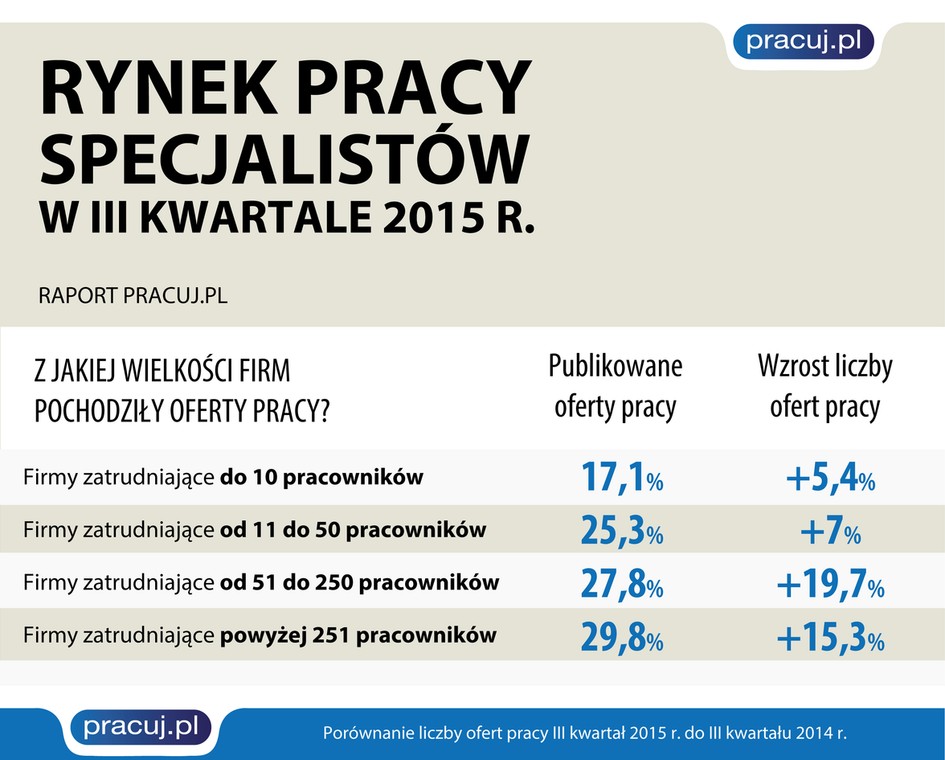 W III kwartale 2015 r. najwięcej ogłoszeń o pracę opublikowali pracodawcy z firm zatrudniających powyżej 250 pracowników – ich oferty pracy stanowiły niemal 30 proc. wszystkich ogłoszeń o pracę z tego okresu. W porównaniu kwartalnym największy wzrost zapotrzebowania na pracowników zgłosiły firmy najmniejsze –wyniósł on 6,2 proc. Porównanie danych rok do roku pokazuje, że wszystkie firmy, niezależnie od wielkości, miały w III kwartale 2015 r. większe zapotrzebowanie na pracowników niż w analogicznym okresie roku poprzedniego.