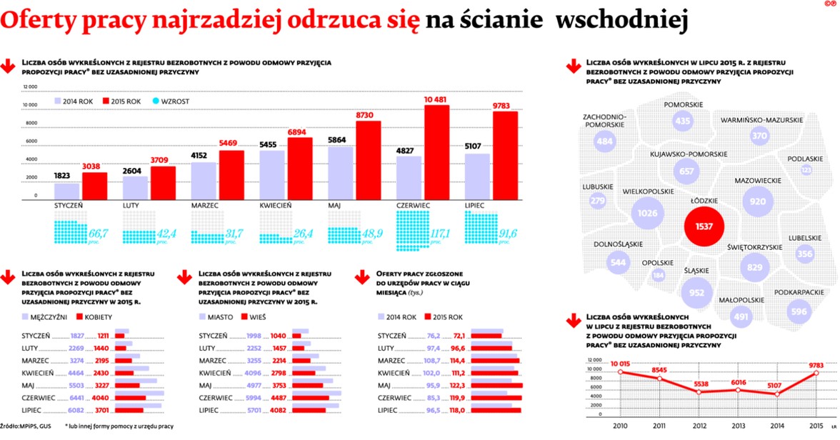 W lipcu urzędy pracy wykreśliły z rejestru bezrobotnych 9,8 tys. osób, które nie zgodziły się przyjąć zaproponowanej im oferty pracy lub innej formy pomocy. To niemal dwukrotnie więcej niż przed rokiem. Trend utrzymuje się już od wielu miesięcy.