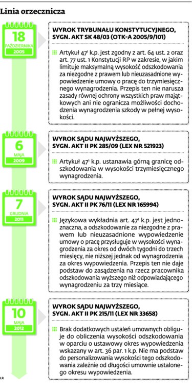 Uzasadnieniem tych roszczeń miał być ponadto wyrok SN z 10 listopada 1999 r. (sygn. akt I PKN 347/99, OSNP 2001/6/197), zgodnie z którym odszkodowanie z art. 45 k.p. w związku z art. 471 k.p. przysługuje za ustalony w układzie zbiorowym okres wypowiedzenia pracy, dłuższy od powszechnie obowiązującego.
