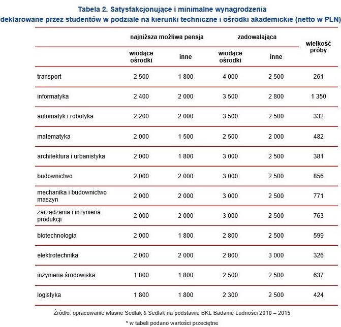 Studenci na kierunkach technicznych posiadali wyższe oczekiwania płacowe niż osoby studiujące na kierunkach humanistycznych, społecznych i innych. Najwyższe oczekiwania płacowe mieli studenci na kierunkach: transport, informatyka, automatyka i robotyka, którzy podjęli naukę na wiodących uczelniach wyższych. Studenci transportu z wiodących ośrodków przeciętnie byliby zadowoleni z wynagrodzenia w wysokości 4 000 PLN netto miesięcznie. Studentów tego kierunku z innych ośrodków usatysfakcjonowałby płaca w wysokości 2 500 PLN. Co ciekawe, kwota ta jest granicą, która określa wysokość wynagrodzenia, poniżej której studenci z wiodących ośrodków nie podjęliby zatrudnienia. Najniższe oczekiwania, spośród osób na studiach technicznych, mieli studenci inżynierii środowiska i logistyki. Niezależnie od ośrodka podejmą oni pracę, w której wynagrodzenie netto wyniesie 1 800 PLN, a zadowoleni będą jeżeli będą zarabiać 2 500 PLN.